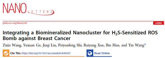 Recently, Prof. Yin Wang’s research group from School of Pharmaceutical Sciences at Shanghai Jiao Tong University published a paper titled Integrating a Biomineralized Nanocluster for H2S-Sensitized ROS Bomb against Breast Cancer in Nano Letters, a leading international journal in the nanotechnology field. The research reveals that combined therapy from gas therapy, chemodynamic therapy, and chemotherapy could be used as a powerful strategy to treat breast cancer. The first author is Zixin Wang, a PhD candidate, and the corresponding author is Prof. Yin Wang.