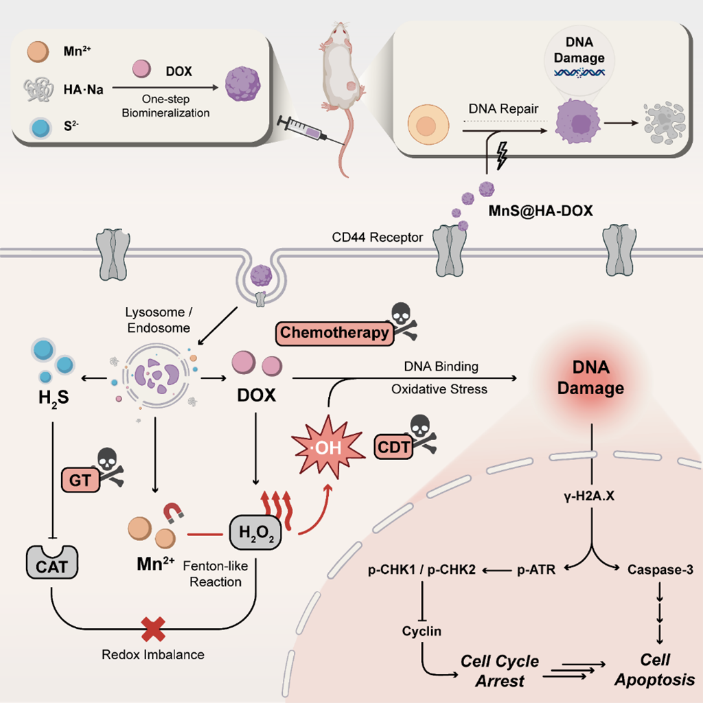 Breast cancer, a deadly disease with high morbidity rates in women, is primarily treated with surgery, chemotherapy, and radiotherapy. However, drug resistance and side effects seriously compromise the efficacy of these treatments. With the development of technology, chemodynamic therapy (CDT) that relies on a Fenton or Fenton-like reaction catalyzed by transition metal ions to convert hydrogen peroxide (H2O2) into hydroxyl radicals (·OH), has been proposed to treat such intractable disease. Nevertheless, the concentration of endogenous H2O2 is evidently insufficient for CDT to achieve the desired therapeutic efficacy. To address this issue and augment the therapeutic efficacy, the research team prepared a biodegradable nanocluster MnS@HA-DOX (MnS@HA-DOX NC) by in situ biomineralization from hyaluronic acid, to enlarge the ROS cascade and boost Mn2+-based CDT. The acid-responsive NCs could quickly degrade after internalization into endo/lysosomes, releasing Mn2+, H2S gas, and anticancer drug doxorubicin (DOX). The Fenton-like reaction catalyzed by Mn2+ was amplified by both H2S and DOX, producing a mass of cytotoxic ·OH radicals. Through the combined action of gas therapy, CDT, and chemotherapy, oxidative stress would be synergistically enhanced, inducing irreversible DNA damage and cell cycle arrest, eventually resulting in cancer cell apoptosis.