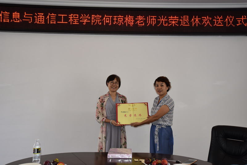 在交流座谈环节,大家纷纷给何老师送祝福,祝她身体健康,生活更充实,心态更年轻。大家共同回忆起以前工作的点点滴滴,感觉时光倒流到三十年前,那是一段激情燃烧的岁月,谈起有趣的片断,每个人放声大笑,说到动情处,有人眼睛里闪烁着晶莹的泪花,没有到现场参加欢送会的老师们,也在信息学院微信群里赠送祝福,通过文字传递着同事之间的恋恋不舍和深厚情感。