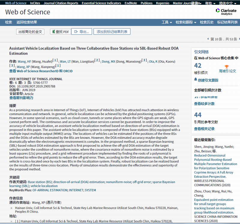 该论文于2019年6月在信息系统、电子与电气工程领域国际顶级(Top)期刊《IEEE Internet of Things Journal》(IF=9.515,中科院JCR分区工程技术1区)发表,据科睿唯安(Clarivate Analytics)公布的ESI高被引论文(Highly Cited Paper)数据,该论文至今累计被引42次,入选为由Web of Science识别的该学术领域前1%的高被引学术论文。该论文研究报道了一种以三协作MIMO雷达为基站,利用稀疏叶斯学习(SBL)获得精确的DOA信息,实现目标的辅助定位,解决在一些特殊的情况下,如云层、隧道或一些卫星信号较弱时,无法保证持续准确的定位信息服务问题。相关的成果可用于近海船舶辅助定位、车辆辅助定位以及智慧城市位置服务等相关方面。