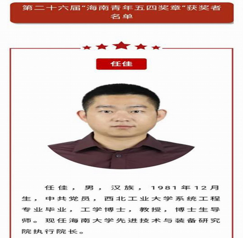 2020年五四青年节来临之际,热烈祝贺买球青年教师任佳教授荣获“海南青年五四奖章”。