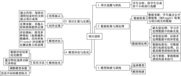 课程步入项目进阶阶段后,学生分组开展与知识点相关的小型项目。教师提供实际数据集,助力学生将知识用于真实场景,具体步骤如图 3 所示。学生在实践中加深对理论的理解,提升数据处理、编程与模型构建技能。而且, 小组合作模式培养了团队协作、沟通及解决实际问题的能力。