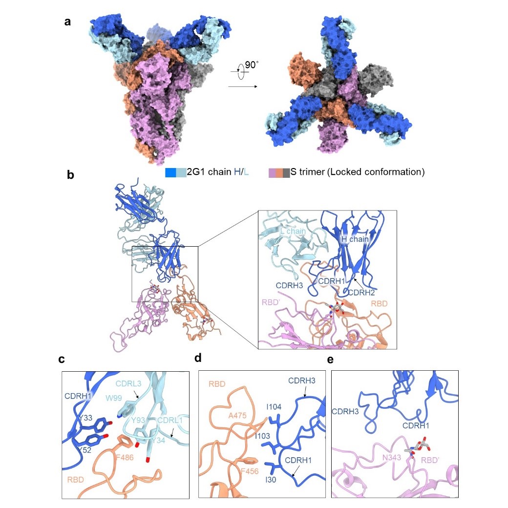 冷冻电镜的结构解析结果表明,抗体2G1通过广泛的疏水作用结合到了S蛋白三聚体的尖端区域,与S蛋白的结合面积非常小,避开了大多数的突变位点,这是其具有广泛抗突变能力的原因(图3)。多个抗体的组合是对抗SARS-CoV-2病毒变异的有效手段,较小的接触面积使得2G1不会轻易与其他抗体产生表位冲突,因此具有较高的联用价值。