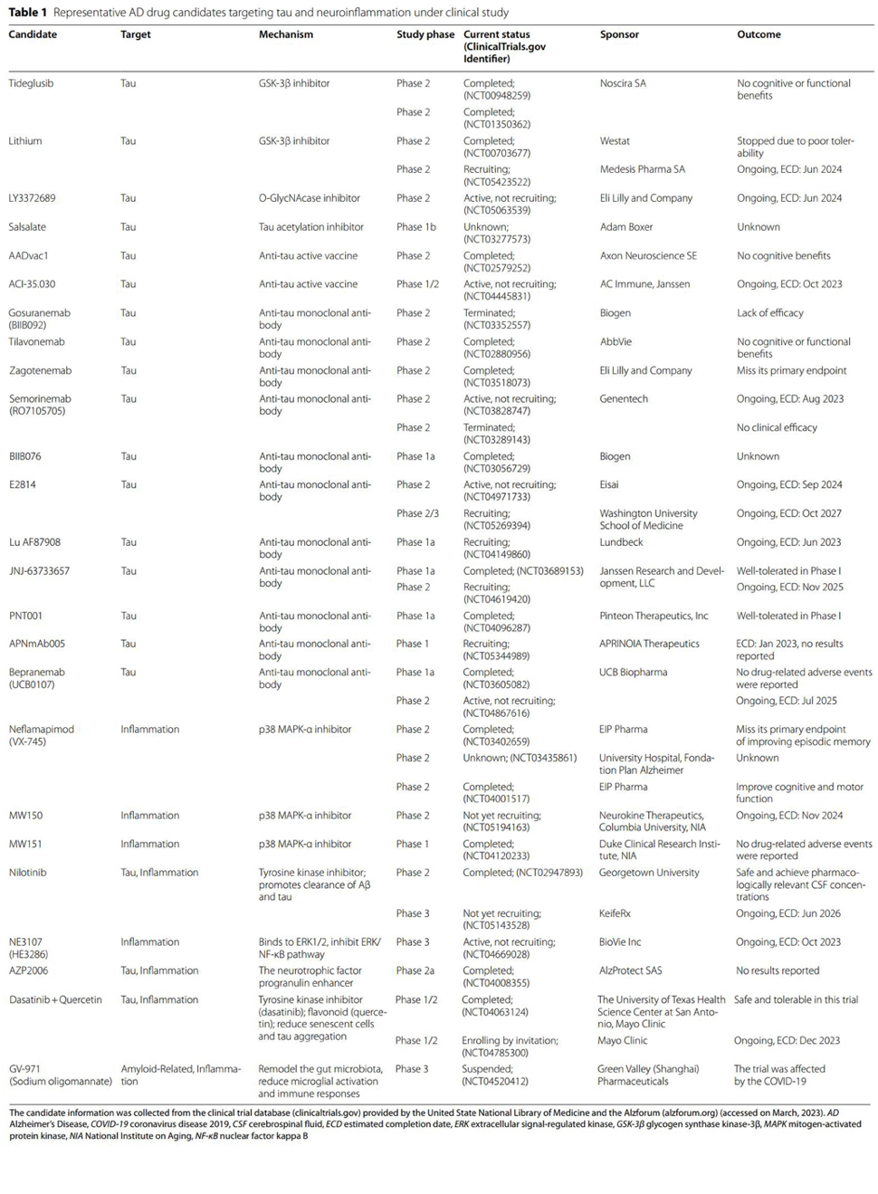 表1. 靶向tau蛋白和神经炎症的AD候选药物(表源: Chen Y, Yu Y., J Neuroinflammation, 2023)