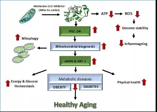 In this PNAS paper, the SJTU research team randomly divided 60 male mice into compound-treated and control groups and characterized a variety of mitochondrial functions, such as respiratory activity, mitochondrial bioenergetics, and biogenesis, and few age-associated comorbidities including reactive oxygen species (ROS) production, glucose abnormalities and obesity in mice over a period of 18-month treatment. The team was able to demonstrate that chronic moderate inhibition of CcO reduces ATP synthesis, promotes mitochondrial biogenesis and mitophagy, subsequently decreasing ROS production and mitochondrial decay, and rectifying vital cellular energy metabolism regulators; thus, effectively refining energy homeostasis and curbing obesity and glucose irregularities linked to aging.
