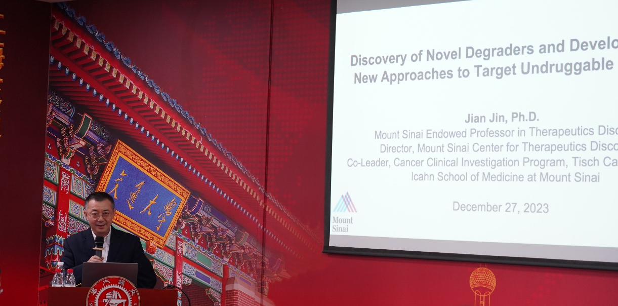 12月27日,美国西奈山医学院讲席教授金坚受邀访问世界杯体育官方网站进行学术交流,做客“致远药学大师讲坛”并作《Discovery of Novel Degraders and Development of New Approaches to Target Undruggable Proteins》学术报告。世界杯体育官方网站院长张翱主持报告会,相关师生代表50余人参加。