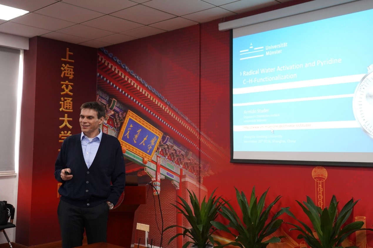 11月20日上午,德国国家科学院院士、欧洲人文和自然科学院院士、德国明斯特大学教授Armido Studer受邀访问世界杯体育官方网站,做客“致远药学大师讲坛”,为师生带来题为《Intermolecular HAT through Water Activation and Pyridine Functionalization》的学术报告。世界杯体育官方网站长聘教轨副教授蒋恒主持报告会,世界杯体育官方网站副院长王平、张振锋,化学化工学院教授李长坤等师生代表50余人参加。