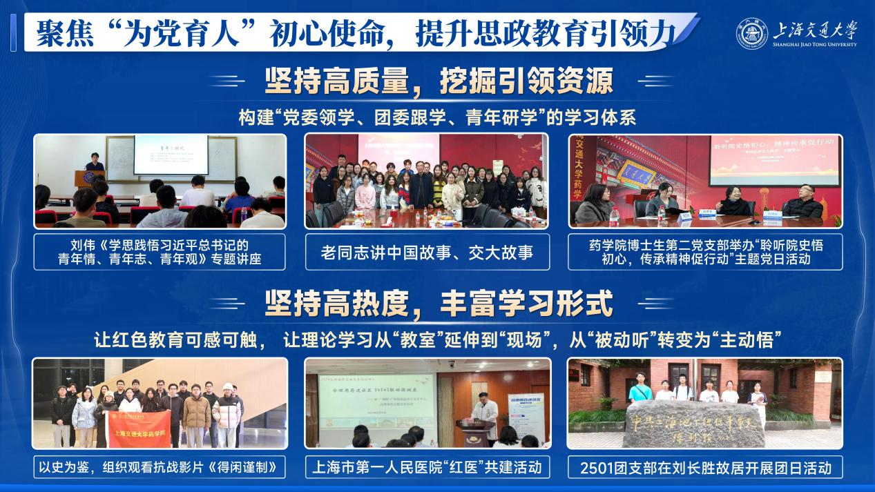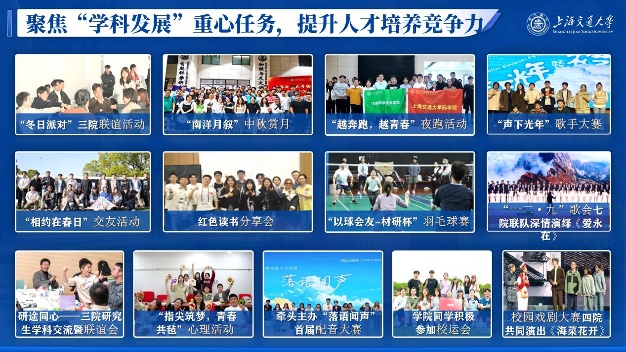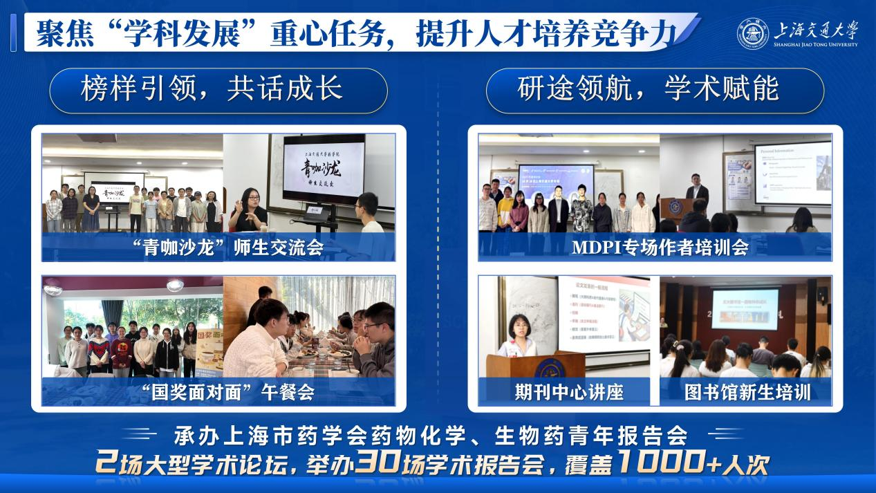 2. 面向药学专业特色,打造“专业育人”新名片围绕世界杯体育官方网站学科、学生特点,开展“靶向”人才培养质量提升计划。贯彻“学在交大”主旋律,营造世界杯体育官方网站“勤学、好学、乐学、互学”的学习氛围,整合校内外优质资源,打造高品质学术交流系列活动。承办上海市药学会药物化学、生物药青年报告会2场大型学术论坛,举办30场学术报告会;开展“学术赋能工作坊”“青咖沙龙”“国奖面对面”午餐会等活动,通过多样化科研引导,助力研究生提升学术素养;组织期末打卡集体自习活动,激发学生自主学习、比学赶超的积极性;举办升学经验分享会,邀请优秀学长学姐分享出国、保研经历;结合生源来源分析学业困难群体特点,日常开展有一对一的心理帮扶,考试周开展硬课、难课学业辅导和课程答疑,全方位为学生学业保驾护航。