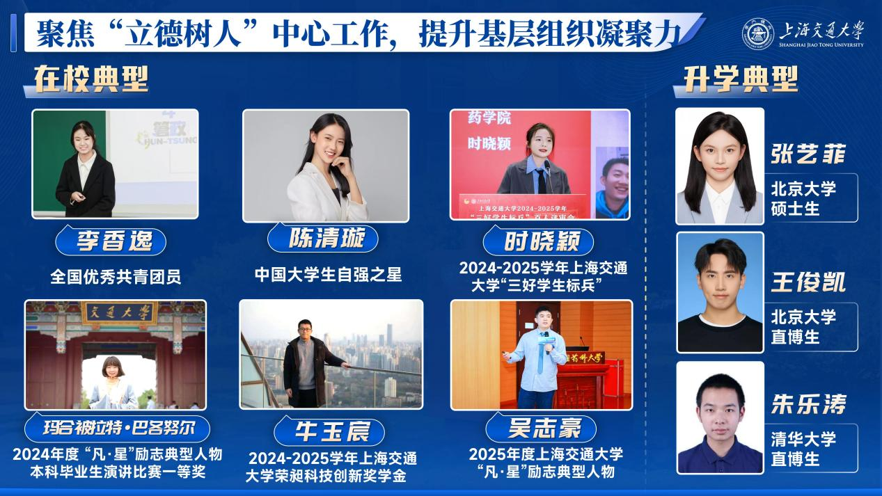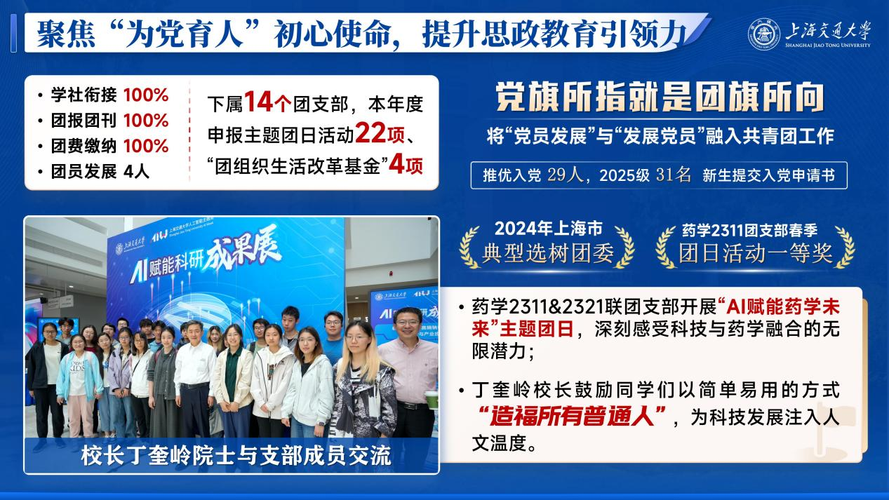 按照“低年级有党员、高年级有党支部”的要求,在学院低年级尤其是本科生班级施行“辅导员、学生党员下班级联系蹲点”制度,实行一班一辅导员、一团支部配备若干联系蹲点学生党员,学院本科生辅导员由优秀在读博士生党员兼任,各学生党支部委员定向蹲点班级团组织,指导团支部建设和活动开展;在硕士和博士等高年级实施“学生党支部建在班上”,由班级党支部指导和带动班级团支部建设。药学2311&2321联团支部开展“AI赋能药学未来”主题团日活动,校长丁奎岭院士与支部成员交流,勉励同学们以简单易用的方式“造福所有普通人”,为科技发展注入人文温度。学院团委获评上海高校活力团团委,21级本科生团支部获评上海高校活力团支部,团委书记陈旦玥入选上海高校活力团干部评选。