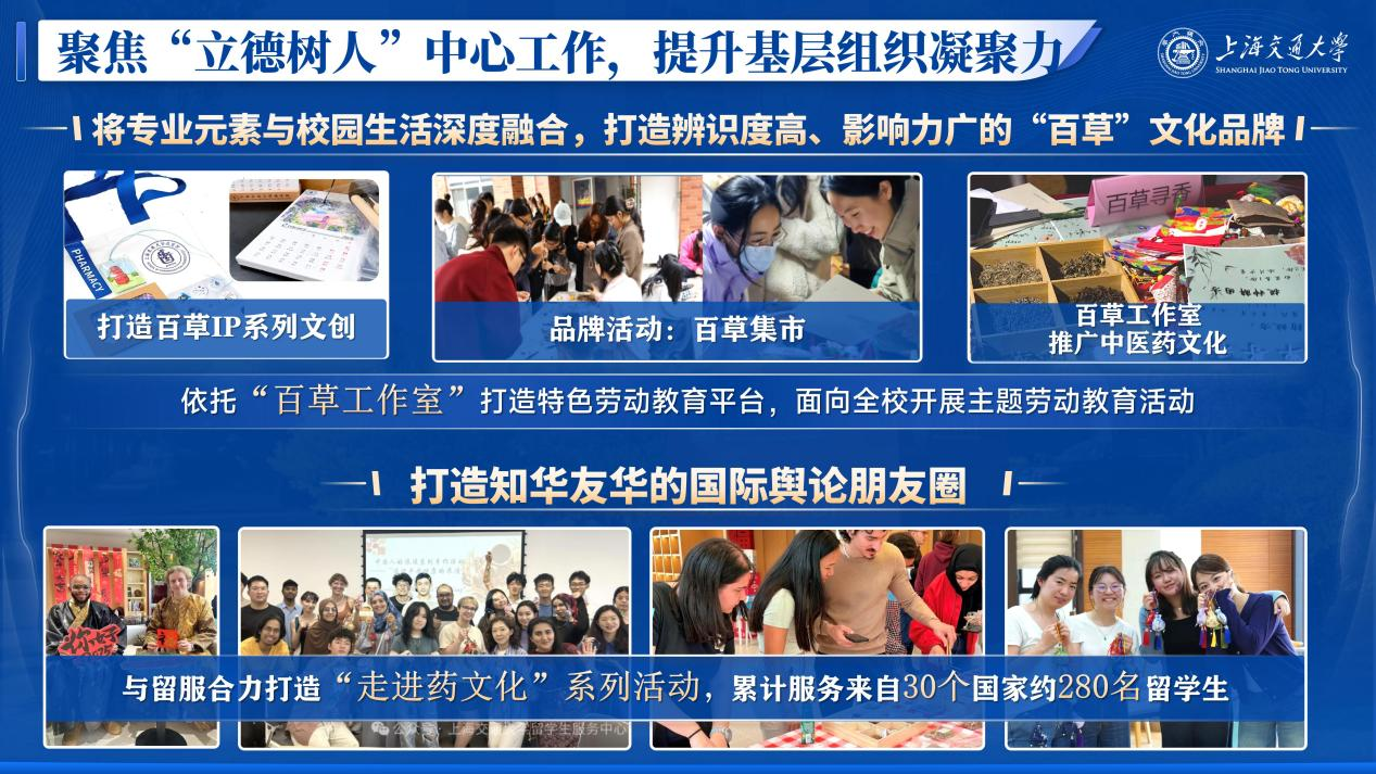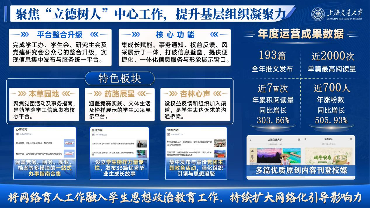 讲好药学故事与世界杯体育官方网站发展故事是学院声誉的重要体现,学院秉持科学、创新与服务社会融合的理念,持续完善多元化立体式宣传阵地,通过人民日报、光明日报、央视频等官方媒体,学校及学院官方网站、微信公众号等平台多渠道发声。完成学生会、研究生会及党建研究会公众号的整合升级,推出“SJTU药学工坊”,设置“本草园地”“药路辰星”“杏林心声”三个特色板块,打造集成长赋能、事务通知、权益反馈于一体的世界杯体育官方网站学生成长支持平台,有效打破信息茧房,为学生提供便捷化、一体化的信息服务渠道,全年发布推文193篇,累计阅读量近7万,成为信息传递的“主渠道”、服务同学的“微平台”,将网络育人工作融入学生思想政治教育工作,网络化引导的影响力持续扩大。
