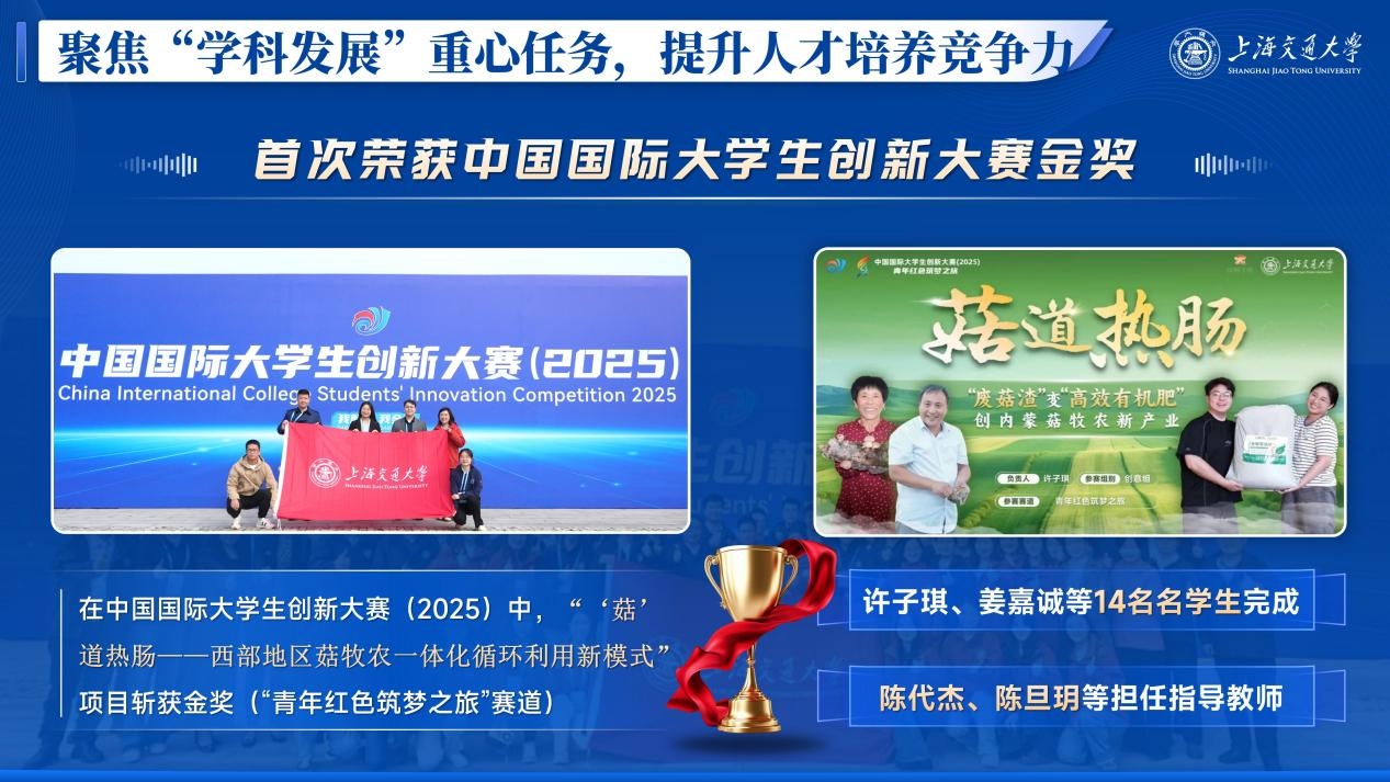 修订完善世界杯体育官方网站双创顶级赛事激励奖励制度,将赛事指导成果纳入专业教师年终考核,与绩效评定、奖金发放、招生名额、评优评先挂钩,充分调动专业教师参与科创指导的主动性;搭建“项目孵化-竞赛转化-成果落地”的全链条科创培育体系,广泛引导青年学子参与与“PRP”“大创”等科研训练课题,深度动员挖掘优质项目,以高水平学科竞赛为抓手,带动全院形成钻研学术、争先创优的浓厚氛围。今年科创竞赛成果取得历史性突破,在中国国际大学生创新大赛(2025)中,“‘菇’道热肠——西部地区菇牧农一体化循环利用新模式”项目首次斩获金奖,显著提升了学院在药学领域的人才培养口碑与学术影响力。